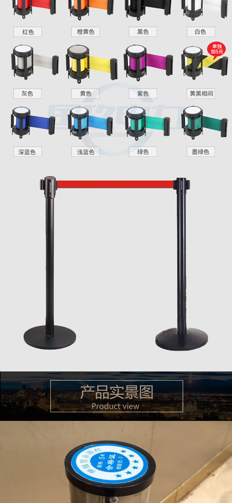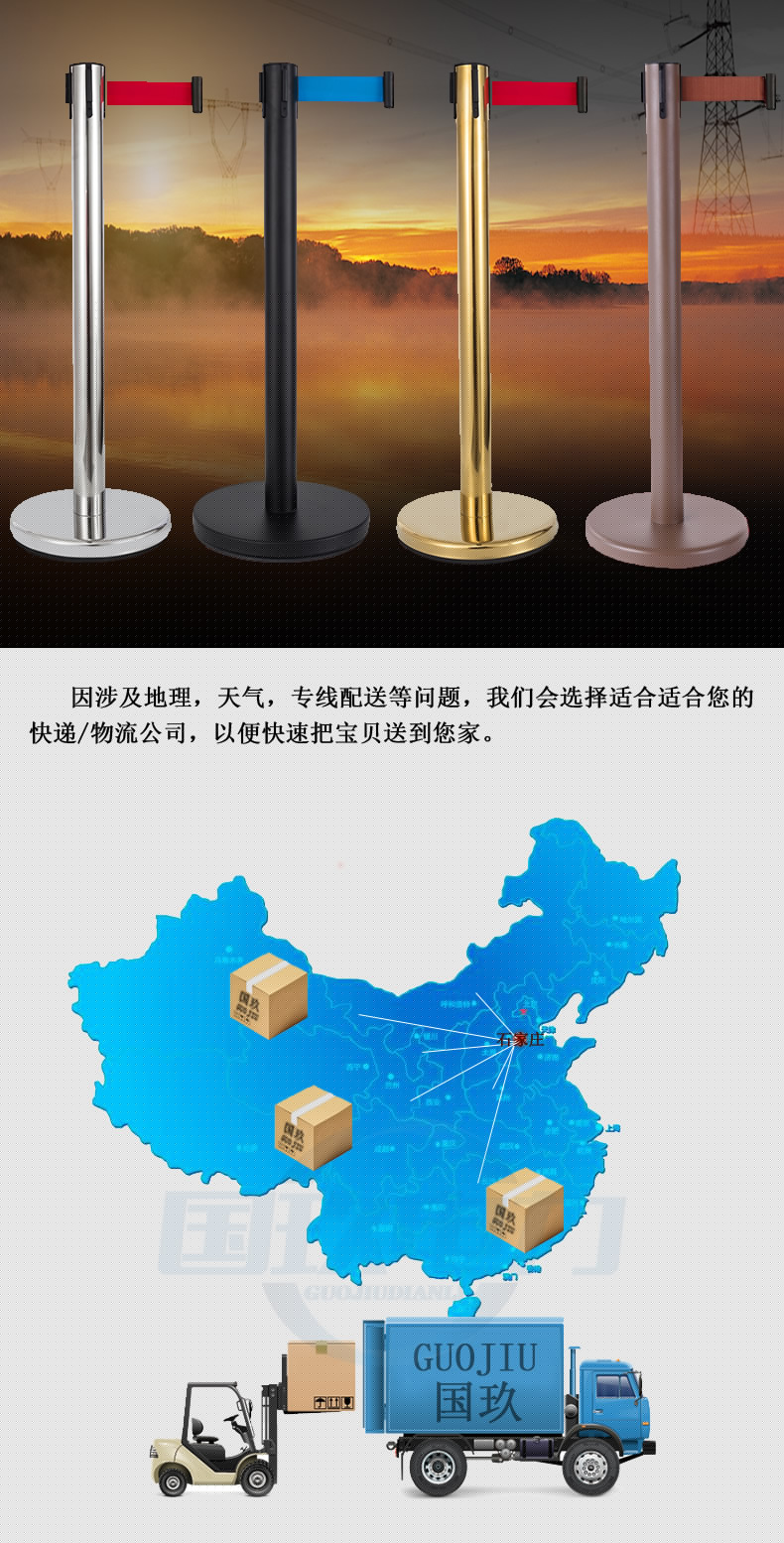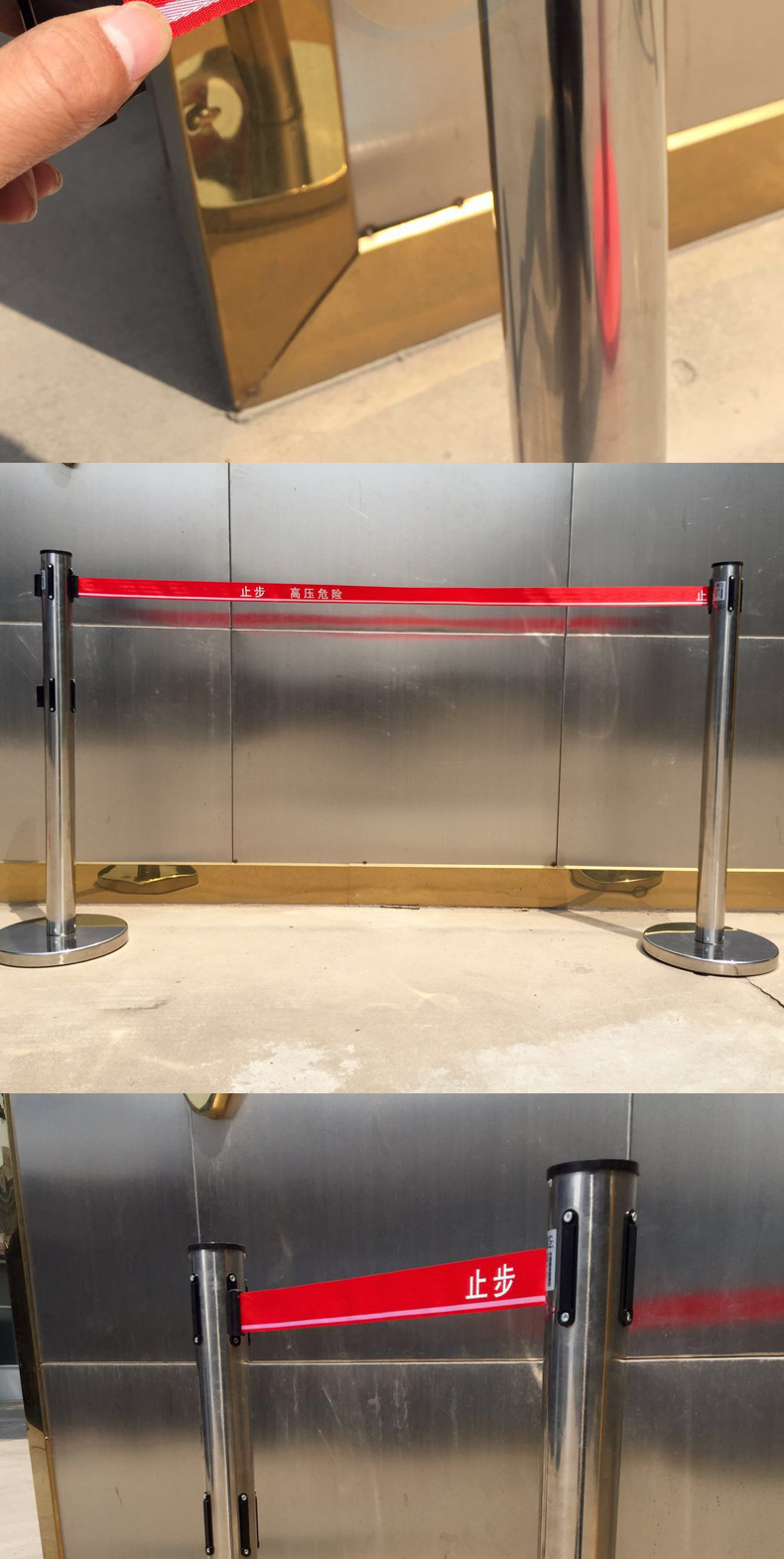 不銹鋼帶式伸縮圍欄警示圍欄帶能自動縮到桿中,桿采用不銹鋼材料制成,圍欄帶采用錦綸強(qiáng)絲織帶,四個(gè)方向均可掛帶。圍欄帶材質(zhì)為錦綸高強(qiáng)絲帶拉力大于5KN,帶子長度3米,寬度50mm,厚度0.5mm,帶面為上紅、下黃,警示標(biāo)語為“止步,高壓危險(xiǎn)”立桿為不銹鋼材質(zhì),外徑76mm,圍欄總高度1000mm,底座材質(zhì)為鑄鐵,上面有不銹鋼外罩,直徑350mm,高50mm。