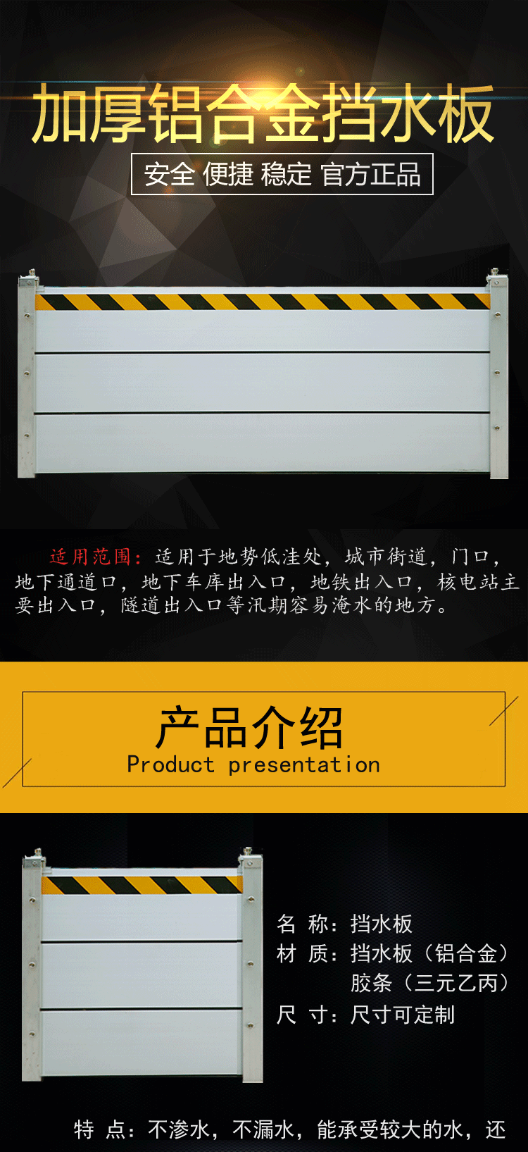 擋水板表面經(jīng)過防腐處理,堅(jiān)硬、美觀。擋板上方50mm處貼有黃黑相間的反光條,可在燈光或其他光源的照射下反射光線,起到對人員的警示作用,方便人員進(jìn)出!