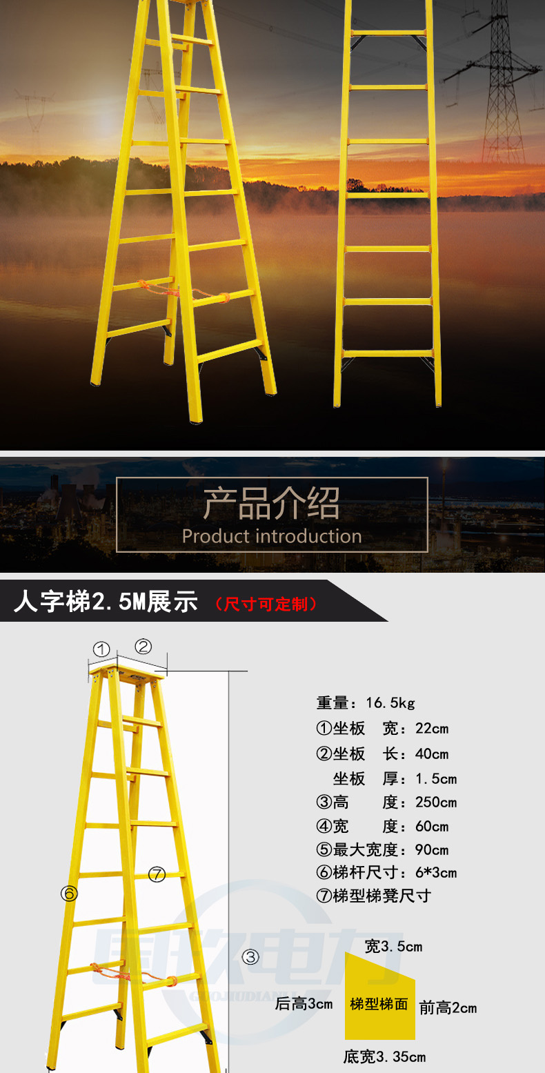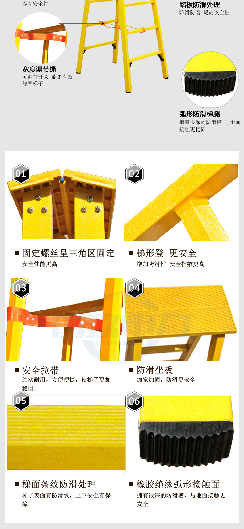 絕緣梯分為絕緣單梯,絕緣軟梯,絕緣竹節(jié)梯(魚竿梯),絕緣關(guān)節(jié)梯,絕緣單直梯,絕緣合梯,絕緣人字梯,絕緣升降梯(絕緣人字單升降梯,絕緣伸縮合梯,絕緣伸縮人字梯),絕緣凳,絕緣踏步凳,絕緣高低凳,絕緣高凳,絕緣升降平臺,全絕緣腳手架等。